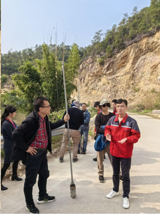 11月25日上午,在江西地质七队杨斌和李家桢两位稀土矿项目负责人的陪同下,betway官网 教师调研了赣县夏湖重稀土矿区,考察了夏湖离子吸附型重稀土矿的花岗岩风化壳剖面。杨斌同志详细介绍了夏湖离子吸附型稀土矿床的地质特征和勘查找矿历史,随后两位负责人同志演示了离子吸附型稀土矿的勘查技术方法以及七队独立研发的新型勘查工具——赣南钻的使用方法。老师们对该类型稀土矿的成矿机理、赋存机制及勘查技术展开了热烈的讨论,并纷纷尝试利用赣南钻开展风化壳野外取样工作。