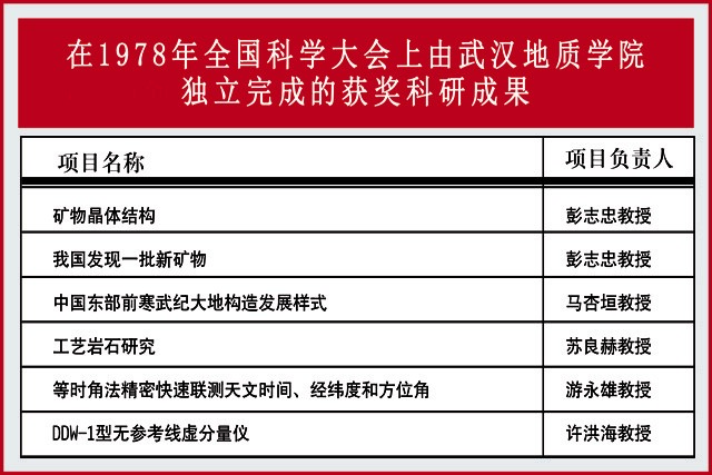 大会举行了隆重的颁奖仪式,表彰了新中国成立以来近30年全国各条战线涌现出来的7657项科研成果,表彰了826个先进集体和1192名先进科技工作者。武汉地质betway官网 受到表彰的重大科技成果28项,其中由我校独立完成的成果6项,与兄弟单位合作完成科研成果22项。彭志忠被评为先进科技工作者,他领导的实验室荣获先进集体奖,他领衔研究的矿物晶体结构、我国发现一批新矿物等2项成果是6项我校独立完成的获奖成果中的两项,占比1/3。武汉地质betway官网 被授予10份奖状,其中有4份是颁给彭志忠的,占比40%。学校获奖数量居于湖北省乃至全国高等院校前列。这是对我校武汉地质betway官网 时期办学水平的充分肯定和鼓励鞭策,也是对彭志忠的莫大肯定和鼓舞。包括我校在内的全国科教工作者的积极性、创造性被有效激发出来,只争朝夕、奋发图强,为早日实现科学技术现代化多作贡献的氛围很快浓厚起来。