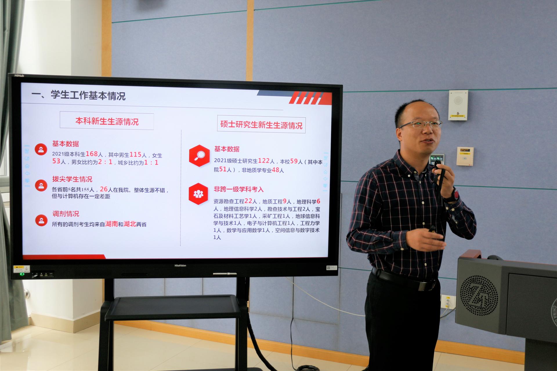 10月9日上午,betway官网 2021年秋季全院教师大会在东区教学综合楼C座106举行。大会在雄壮的国歌声中拉开序幕。betway官网 党委书记周刚以《学习“七一”重要讲话精神,弘扬伟大建党精神》为题为全院教师上专题党课。院领导章军锋院长、朱宗敏副院长、赵军红副院长、吴元保副院长、赵得爱副书记分别就岗位聘用、实验室建设与办公空间调整、本科生教学、研究生招生、一流学科与科研团队建设、学生工作等方面进行汇报交流。谢树成教授就betway官网 一流学科建设与老师们进行了交流。