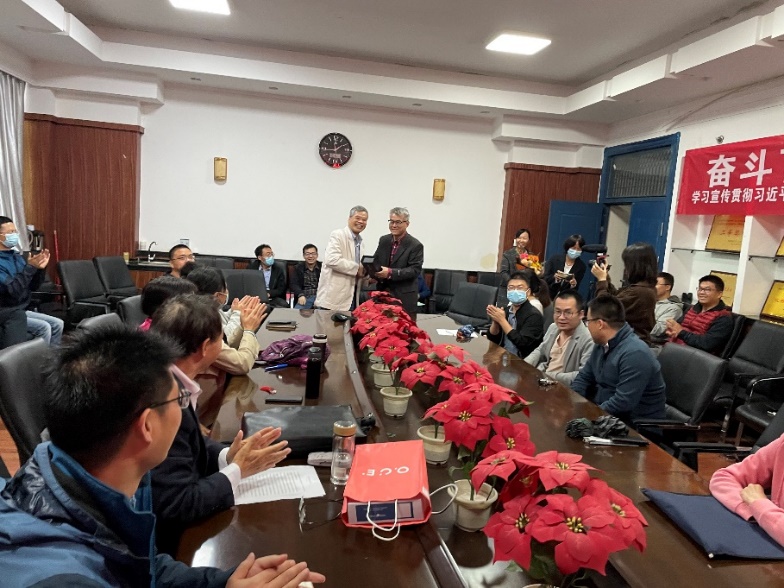 (夏彬、佘振兵)2021年10月15日地球物质科学系在主楼412为陈能松教授举行了隆重的退休欢送仪式,该系因为野外工作原因未能到场的几位老师也通过线上视频会议形式参与了仪式全程。