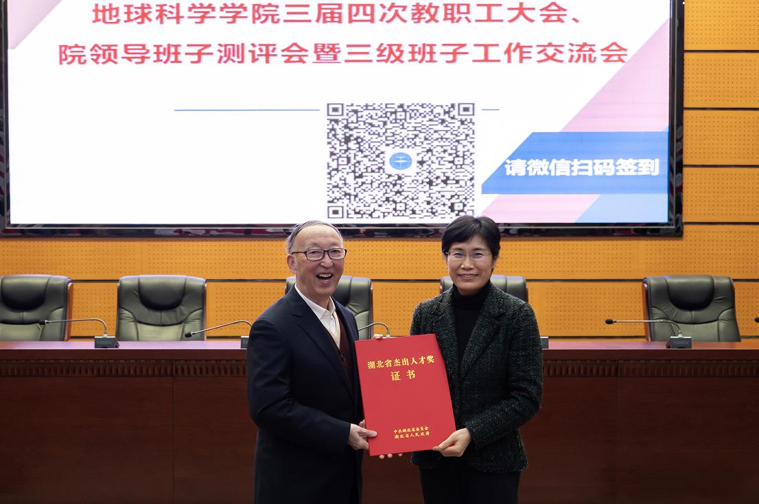 学校党委书记黄晓玫为殷鸿福院士颁发湖北省杰出人才奖证书