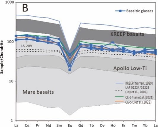 对无斑细粒玄武岩碎屑中微量元素的原位LA-ICP-MS测试发现它们具有较高的稀土元素含量(图3)。这种相对高的稀土含量和配分模式,与部分年轻的月球陨石Northwest Africa (NWA) 032, NWA 4734, LaPaz Icefield (LAP) 02205相似,反映了这些玄武岩可能是月幔经历了低部分熔融程度的产物。此外,在月壤中还发现了玄武质撞击玻璃,其微量元素成分与玄武岩岩屑一致,暗示其可能是原地的玄武岩碎屑撞击熔融的产物。