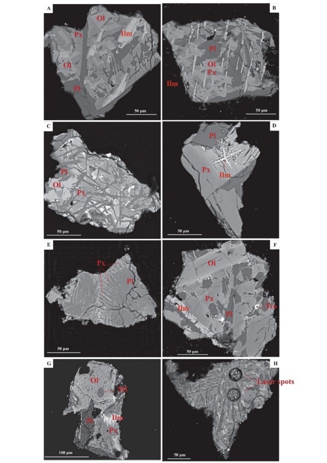 何琦老师及其科研团队此次研究聚焦于表取月壤(CE5C0400)中玄武岩的碎屑颗粒(basaltic fragments,100–400μm,图1),通过多种分析手段研究其具体的岩相结构及原位地球化学特征,并结合MELTS模拟反演了玄武岩的演化过程。
