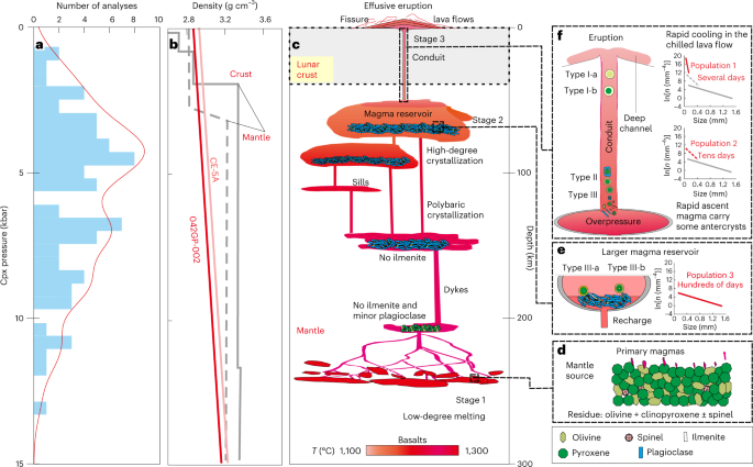 图3:年轻的嫦娥五号玄武岩的岩浆通道系统的示意性结构和动力学模型。a、单斜辉石-熔体压力计结果柱状频率分布图。b、嫦娥五号玄武岩的密度随深度的变化曲线。c、嫦娥五号玄武岩的岩浆通道系统。d、含橄榄单斜辉石岩发生低程度部分熔融形成原生低钛玄武质岩浆。e、由于密度和流变屏障,上升的熔体在月幔顶部停滞,在40–100 km处形成了主要的岩浆储库。f、在喷发通道中岩浆迅速喷发到月球表面。