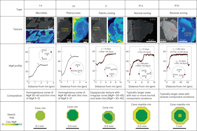 根据单斜辉石结构和成分环带其可为三种类型(图2)。对单斜辉石II型和III型内部环带进行Mg-Fe扩散模拟计算结果表明,这些晶体经历了几天到至少几百天的停留时间,这与CSD方法获得的存留时间相当(图1)。单斜辉石的成分也记录了其结晶历史,结果显示少量具有高Mg#,Al和Na含量大粒径的单斜辉石斑晶来自于深部储库。对代表了相对较早结晶高Mg#的单斜辉石的温压计算也表明,大多数高Mg#的单斜辉石在2-5 kbar和1140-1200°C下结晶,而一些稀少的晶粒可能是从更深的位置(7-12 kbar和1260-1300°C)挟带而来,pMELTS模拟的结果也证实了这一点。