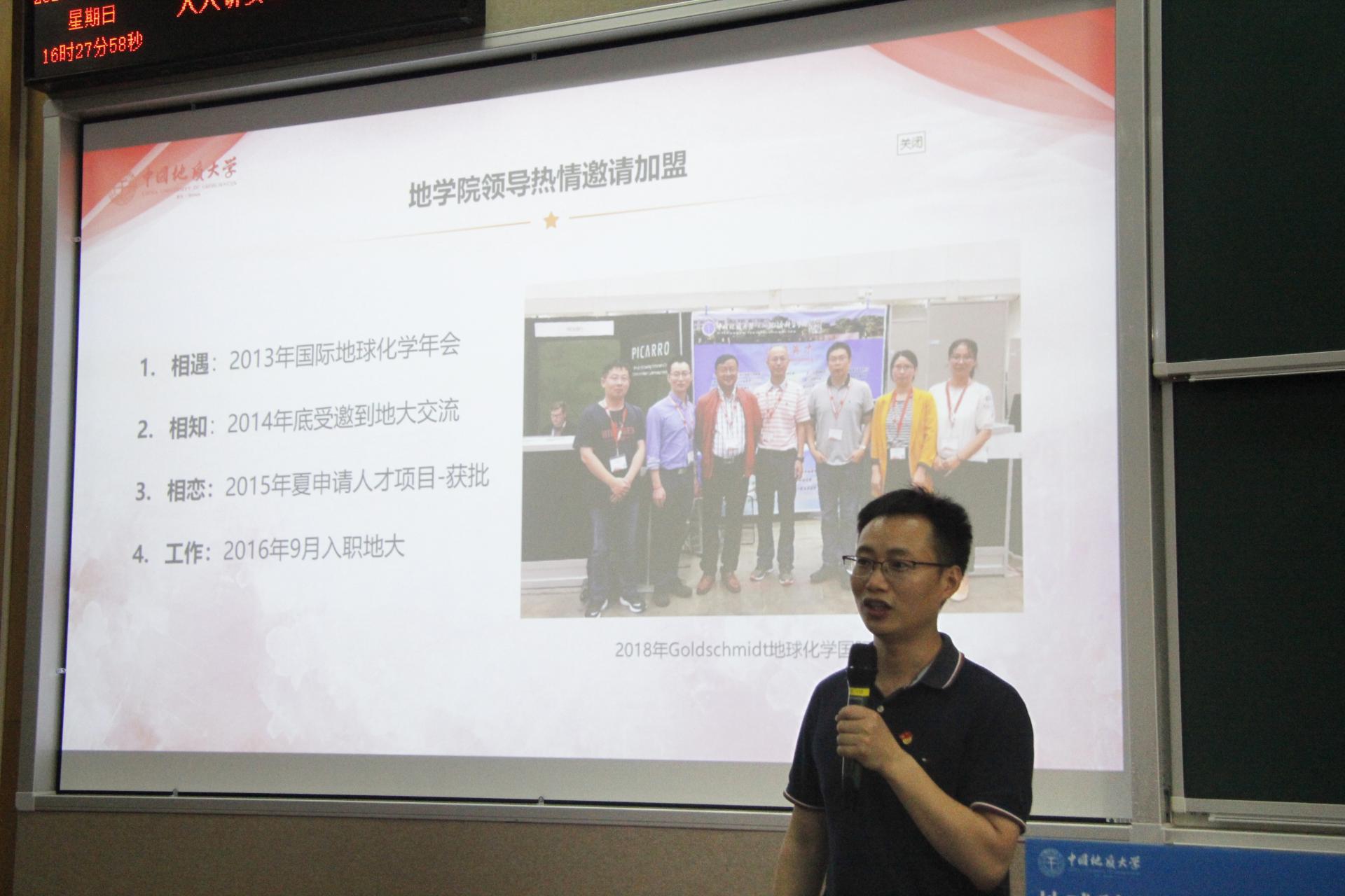 在大学本科期间,汪在聪教授的目标是成为优秀的矿物学家。他回忆起在河南一个金矿进行勘测时的情景,环境苦不堪言,但他乐在其中,也就在那时,扎实的专业课基础以及燃烧的梦想,让他坚定了攻读硕士学位的信心。当时凭借着优异的成绩以及肯下功夫苦干的毅力,汪教授在一众同龄人中十分耀眼,英国帝国理工大学、香港大学等国际名牌大学向他抛出橄榄枝。奈何金无足赤,优秀的他也有短板——“英语”。雅思成绩未达要求,他只能放弃两所大学的offer,但他未曾放弃追逐梦想,转入柏林自由大学进修。出国后他面临着更大的困难与挑战,先是薄弱的英语使他无法与导师正常交流,其次是新的研究领域使得他不能熟练操作实验仪器。经历过短暂的迷茫阶段后,他坚持了下来,并且潜心科研。最终2013年汪教授成功在Nature上刊登论文,将局势扭转,他也因此成为了国际知名的地质学者。几年里他潜心登高,心无旁骛,回首望却,自己已达群山之巅。在交流会上,他与地大的领导相结识,就像是千里马遇到了自己的伯乐,在地大领导的盛情邀请下,汪在聪教授在2014年来我校进行交流。2016年正式进入中国地质大学任职,开启了自己的地大七年。