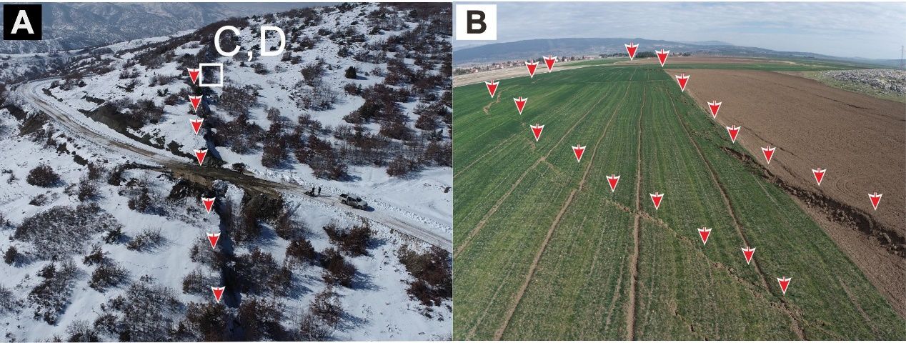 图 3 A. Çardak-Sürgü断层带中切过山脊的同震新生断裂; B. 死海断层NarLı段形成于盆地中央的同震新生断裂