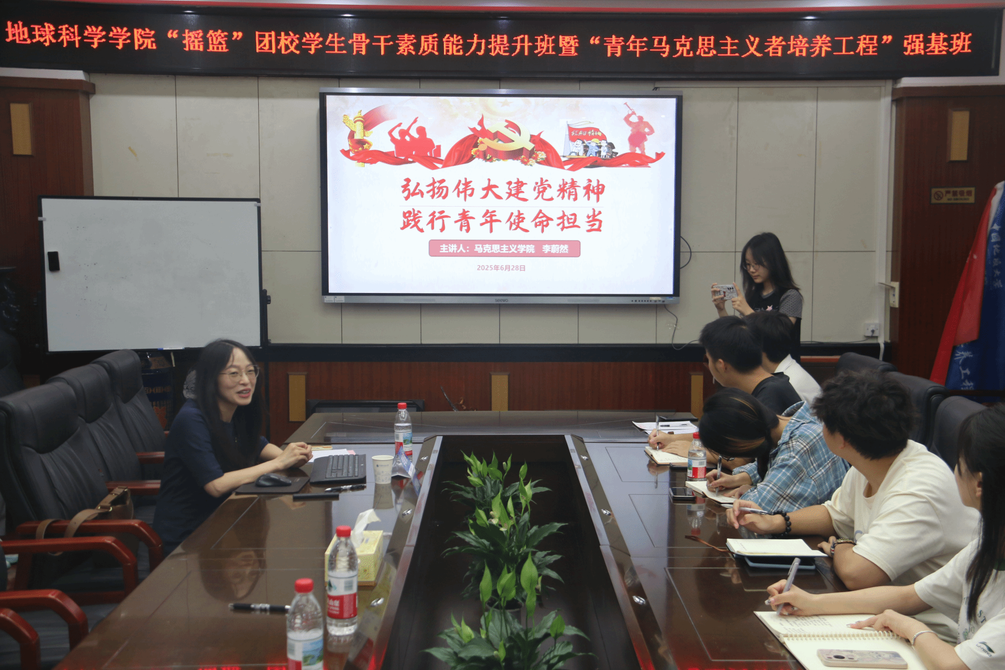 李蔚然老师围绕党史展开课程,简要介绍了中共一大的召开背景,强调党的初心和使命是为中国人民谋幸福、为中华民族谋复兴,并深入阐释了伟大建党精神的深刻内涵,指出新时代对青年提出的新要求,引导全体学员弘扬伟大建党精神,勇担时代赋予的责任和使命。李蔚然老师理论功底深厚,课程内容深入浅出,学员们全神贯注、积极思考,深刻领悟课程内容,纷纷表示将以实际行动践行所学,在新时代展现地学青年的担当作为。