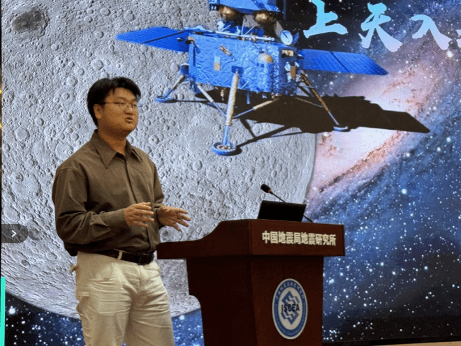 随后,betway官网 “地学之光”科普讲解队成员姜昕接续开讲,以《上天入地,地球化学》为题展现学科交叉魅力。他从嫦娥六号月壤研究切入,结合国际顶级期刊发表的科研成果,讲解月壤中氦-3资源价值、42亿年高铝玄武岩与28亿年低钛玄武岩所记录的月球火山活动史,同时介绍大陆地壳平均成分研究等地球化学核心内容,让在场听众直观感受“从月球到地球”的地学探索脉络,有效促进院所学科交流。