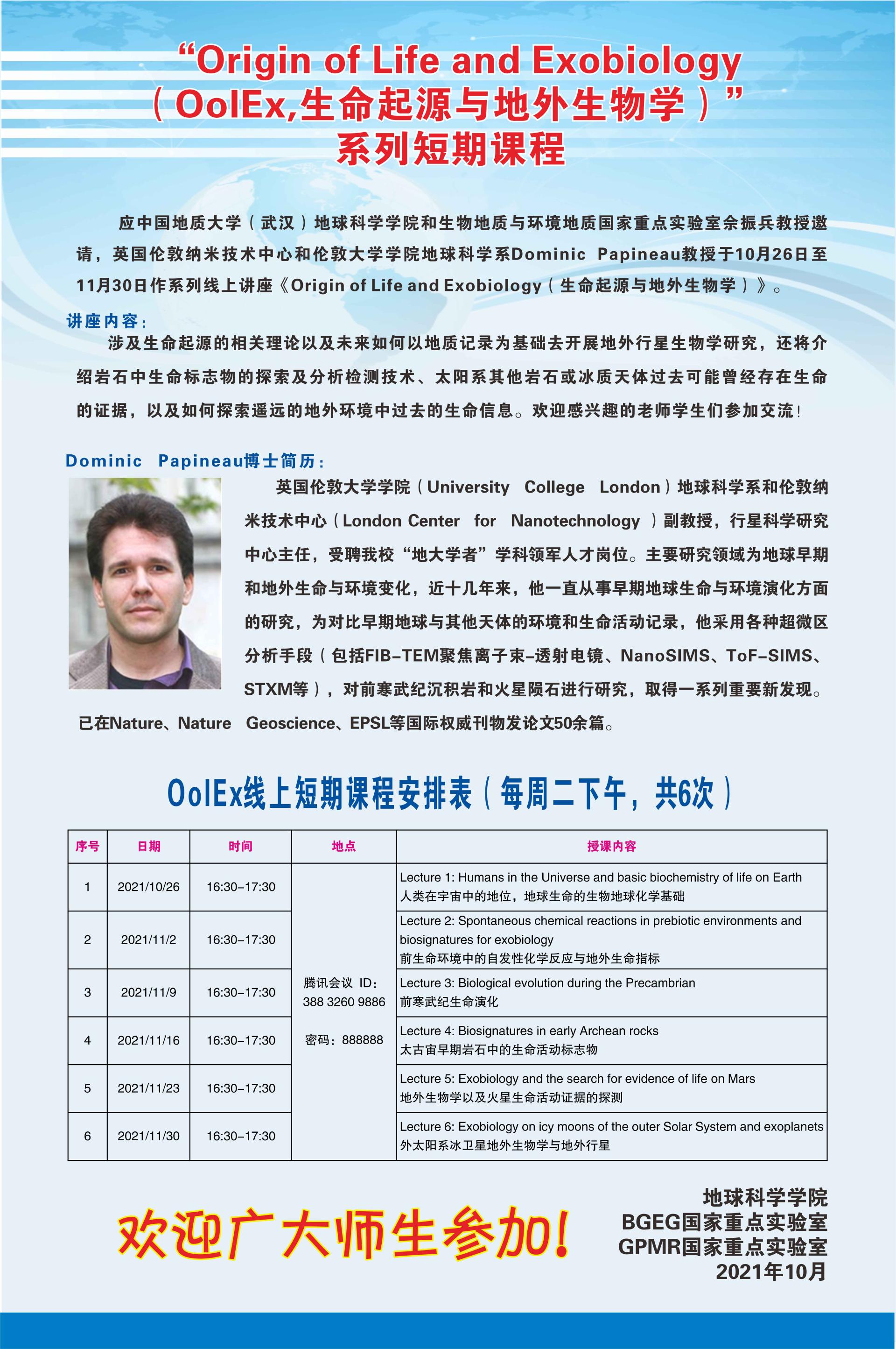 【10月26日】“Origin of Life and Exobiology(OolEx, 生命起源与地外生物学)”系列短期课程