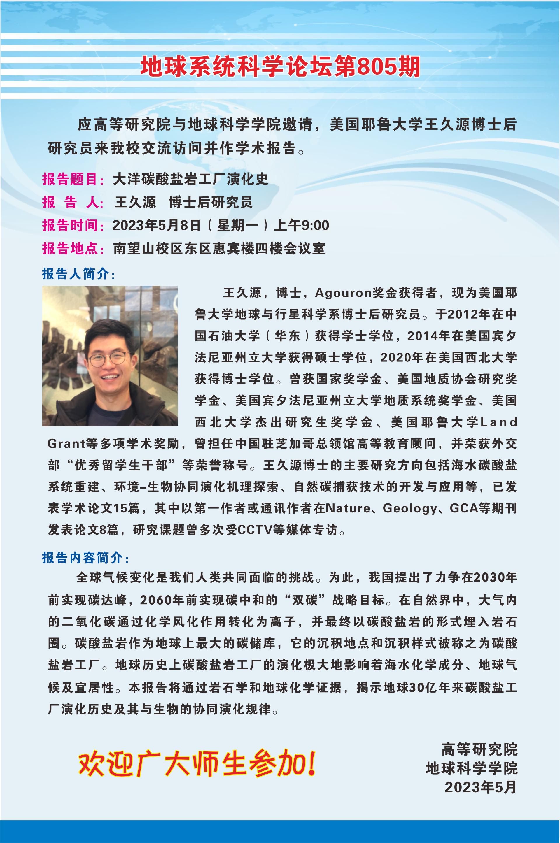 【5月8日】地球系统科学论坛(第805期)-王久源 博士后研究员
