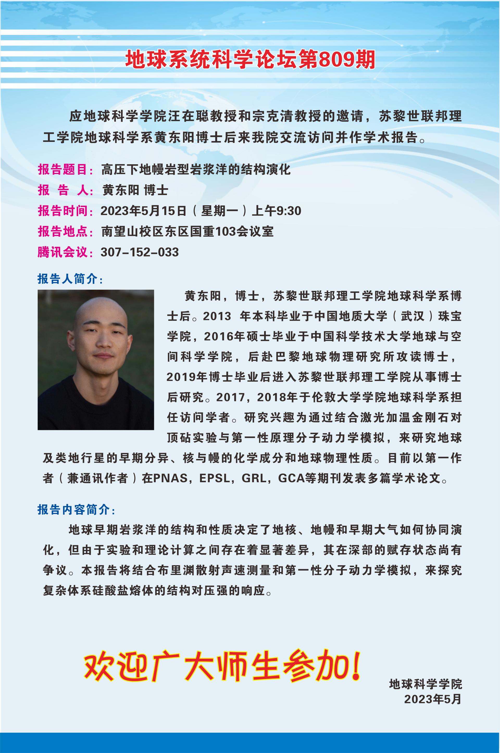 【5月15日】地球系统科学论坛(第809期)-黄东阳博士
