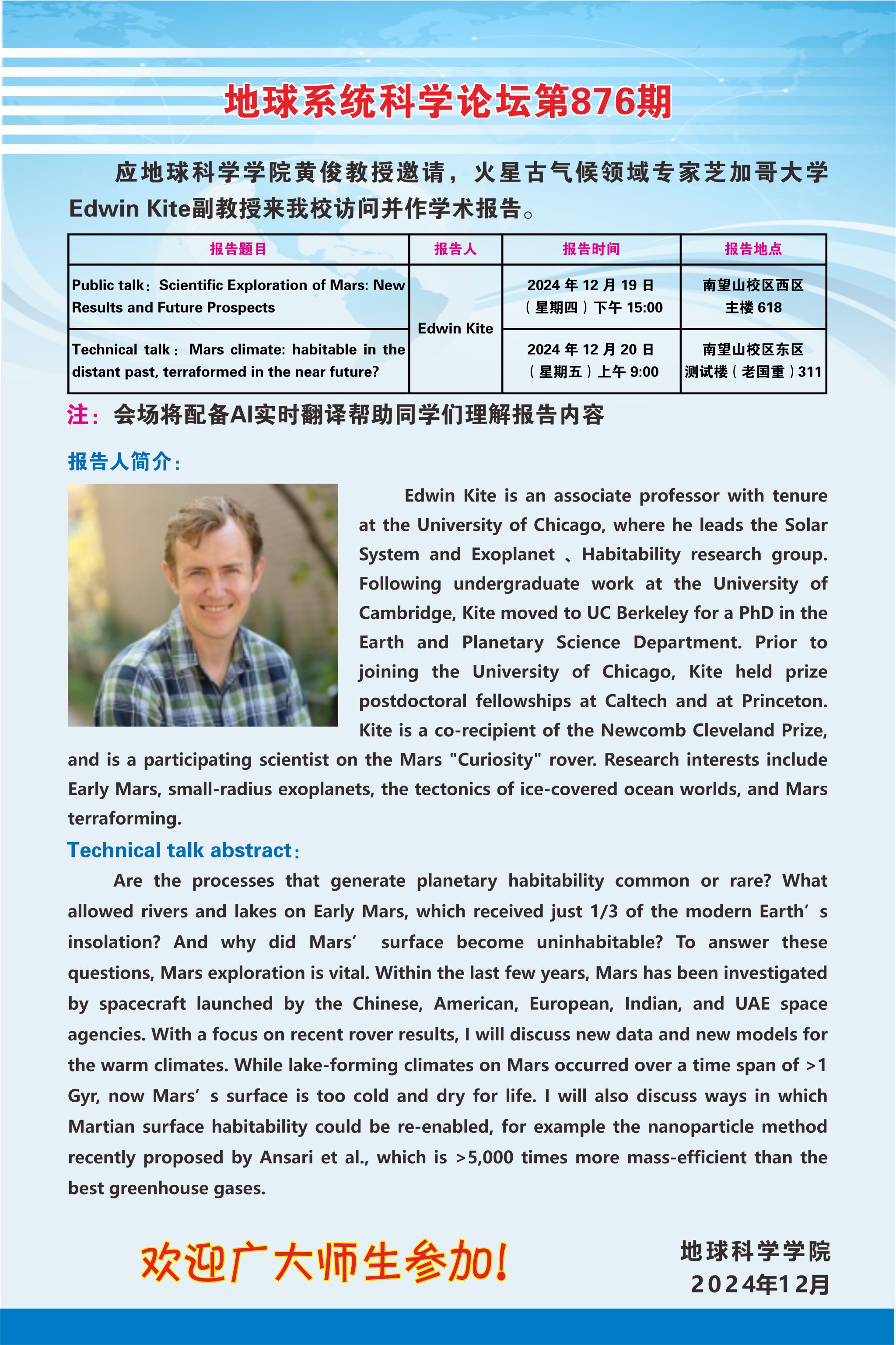 【12月19-20日】地球系统科学论坛第876期-Edwin Kite副教授