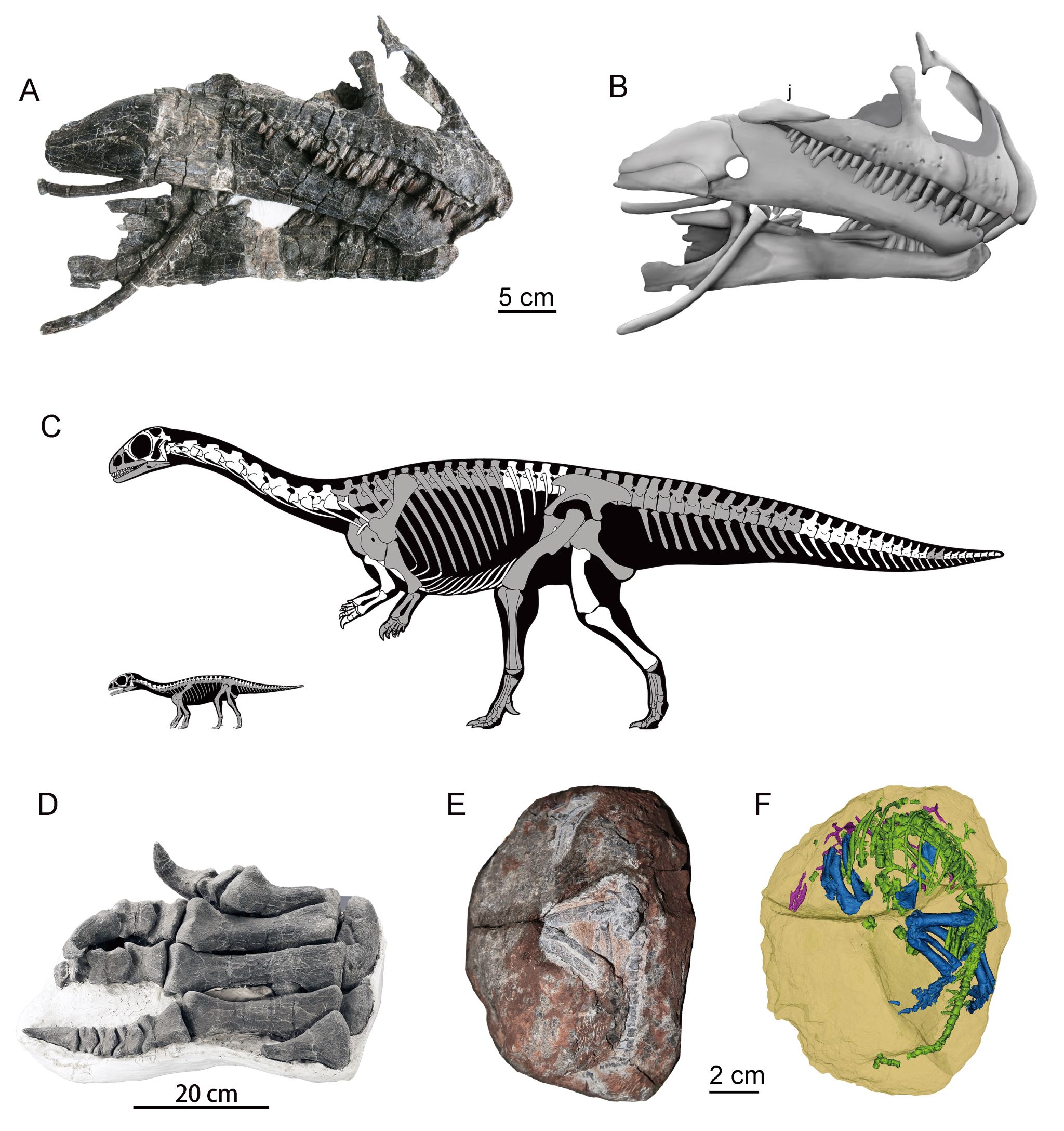 图1. 守护黔龙头骨照片(A)和素描图(B),成体和幼体重建图(C),右侧足骨(D)以及胚胎(E)和三维重建图(F).