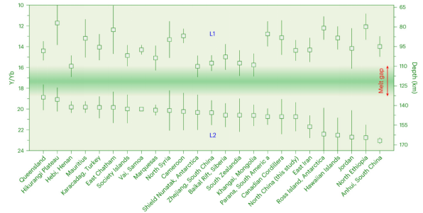 3. 不同构造板块25个地区的大洋/大陆玄武岩具有类似的双峰式Y/Yb比值. 软流圈熔体分层结构 (80–110 km vs. 140–165 km) 在全球范围内广泛分布.