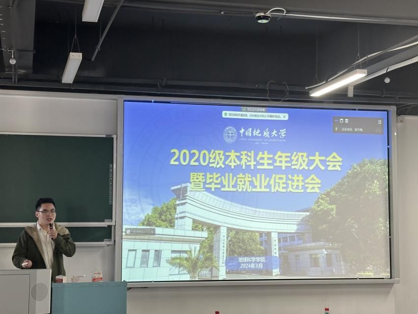 最后,我院2020级本科生黄磊分享了个人求职经验。黄磊从自身的求职经历为切入口,分享了自己求职过程中的心得体会以及积累的宝贵经验,重点分享了自身获得华东冶金地质勘查局八一一地质队工作岗位的经历,鼓励同学们在找工作中做足准备,增强自身自信心并能主动出击。