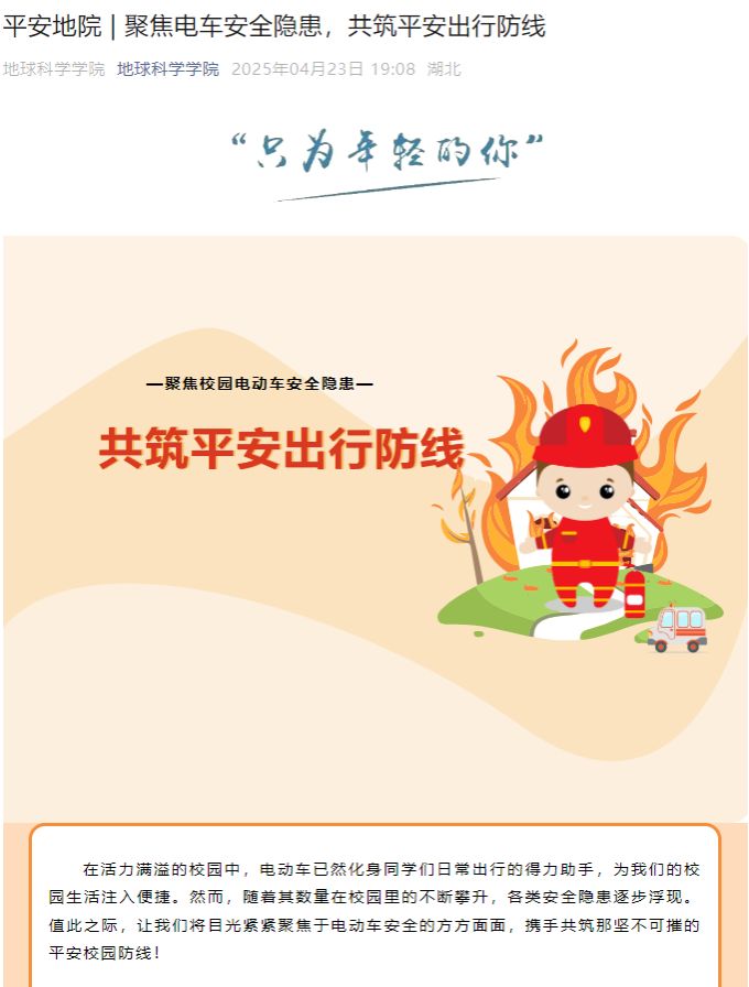 4月23日,学生会发布平安地院系列推文《聚焦电车安全隐患,共筑平安出行防线》,整合政策图解、隐患警示、应急指南等实用信息,并组织学生观看“湖北消防”发布的电动自行车消防安全专题视频,借助新媒体矩阵扩大安全知识传播半径,推动安全理念从线下场景向网络空间延伸。