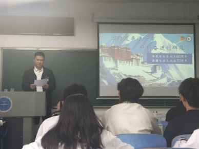 随后,团支部书记何海洋领学“六十年团结发展谱华章,新时代砥砺奋进创辉煌”专题内容。他以西藏自治区成立60周年、新疆维吾尔自治区成立70周年为背景,并以西藏自治区为例介绍了民族共同体的融合和民族进步的成功实践。